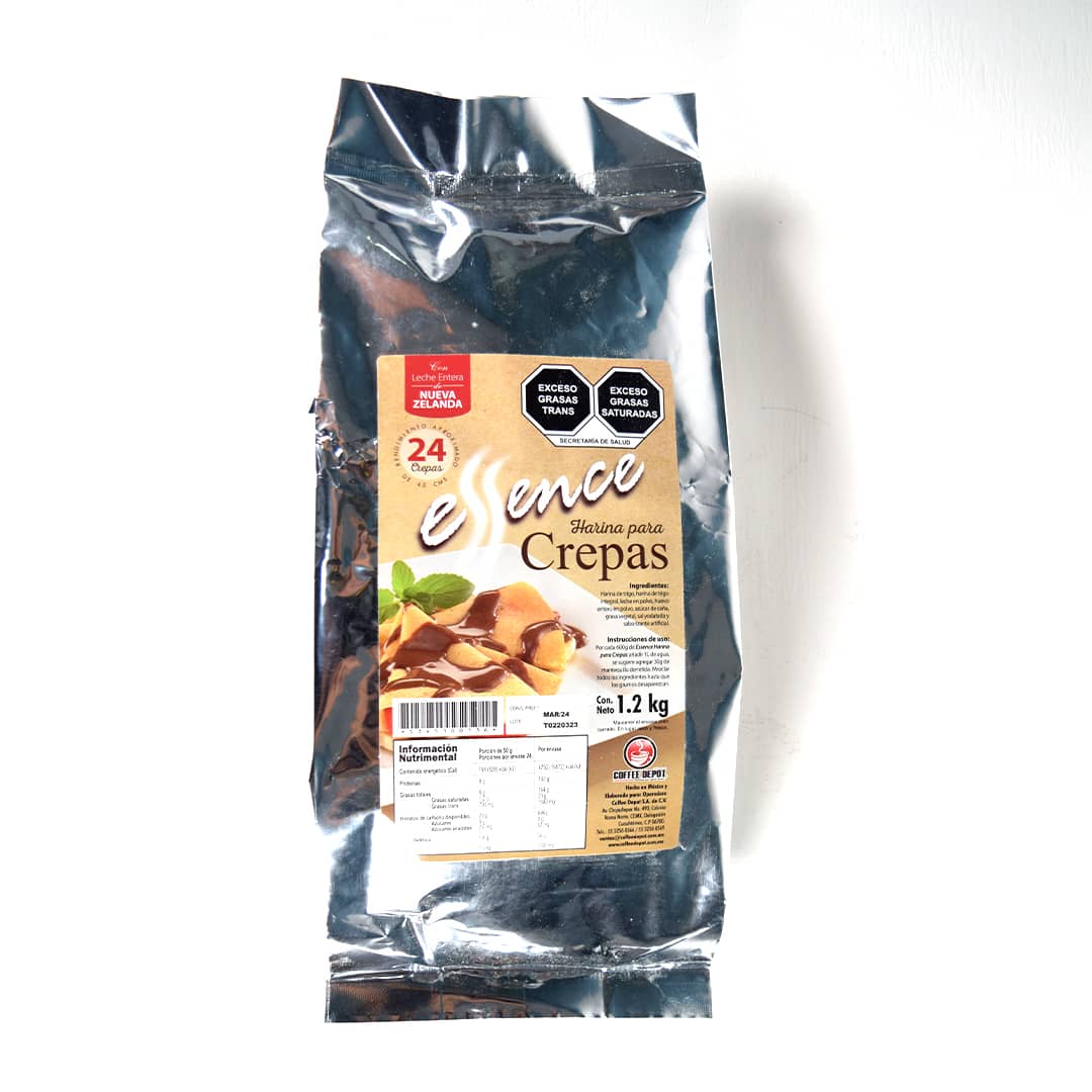 Preparación: Por cada 600 gramos de Essence Harina para Crepas añadir 1L de agua, se sugiere agregar 30 gramos de mantequilla derretida. Mezclar todos los ingredientes hasta que los grumos desaparezca.